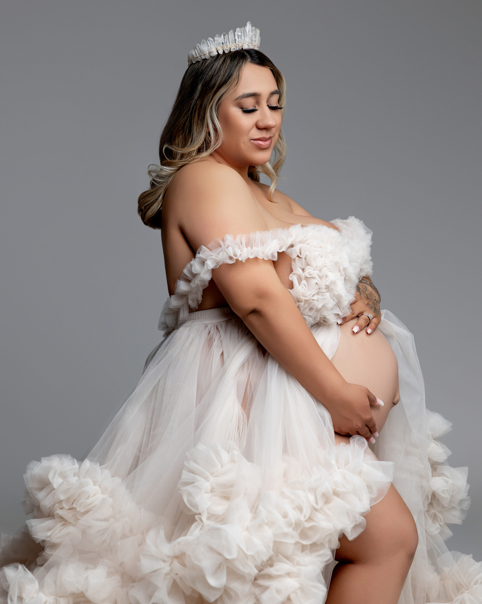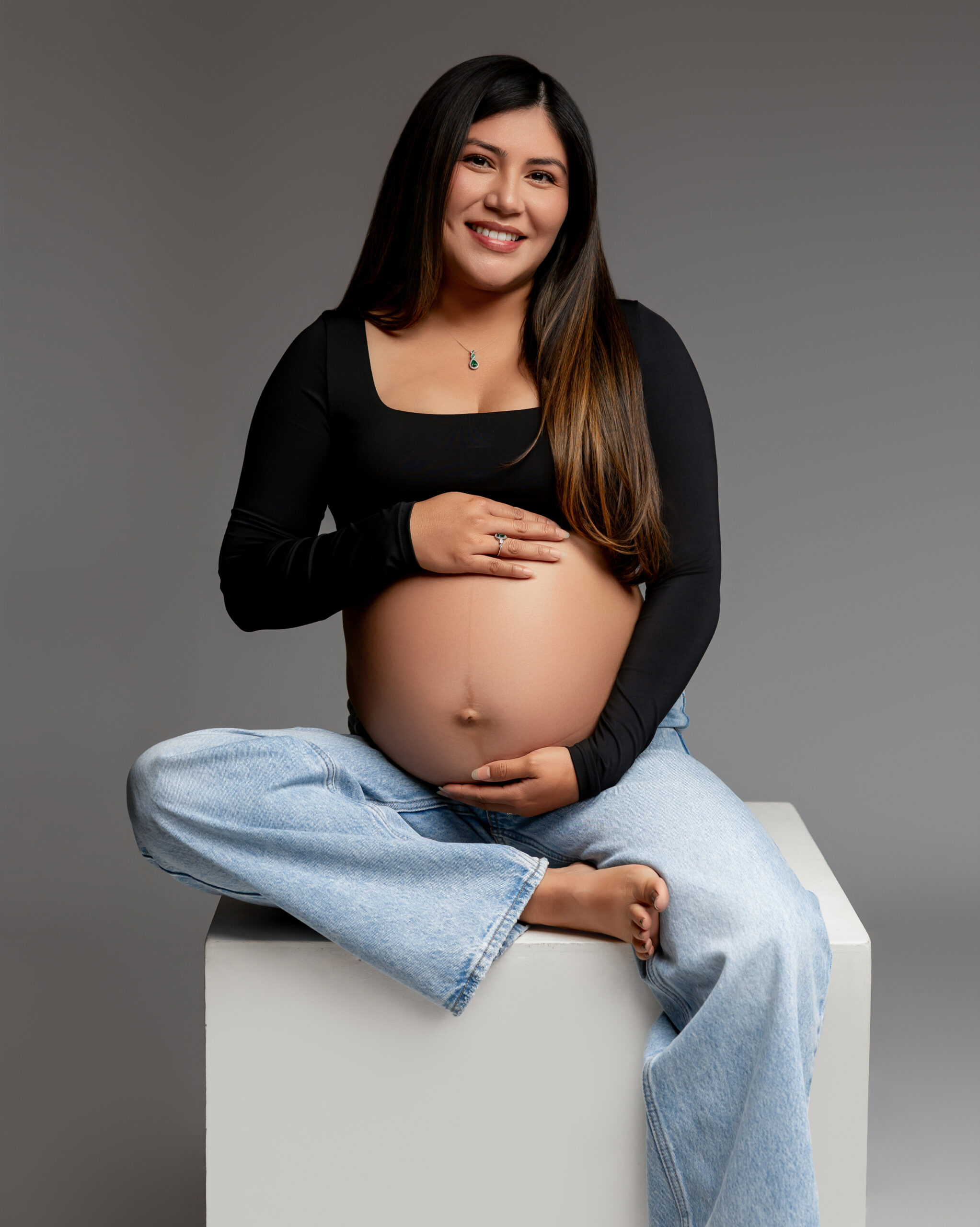 A glowing mother-to-be in a flowing gray gown cradles her baby bump in studio. Photographed by Inland Empire maternity photographer Kaitlyn Dawn Photography.